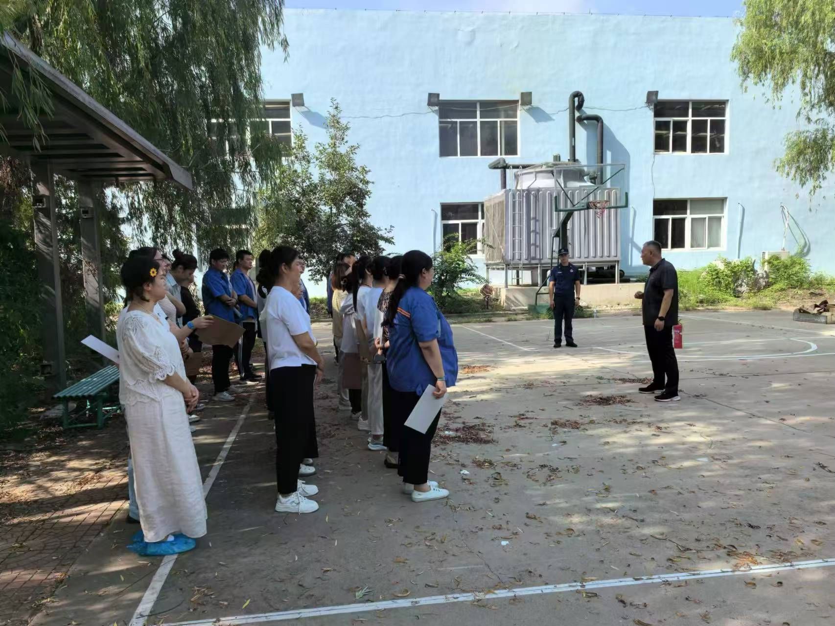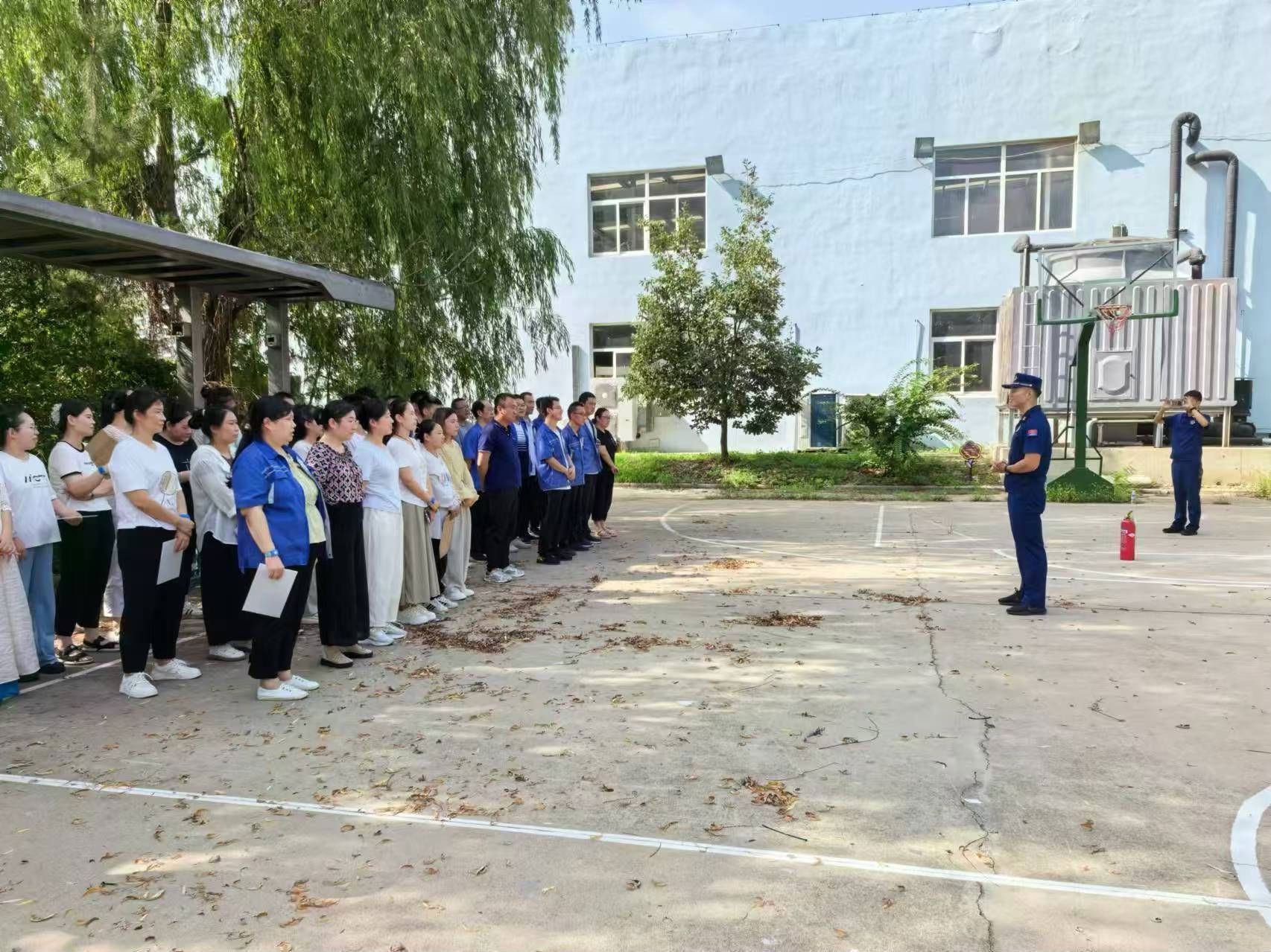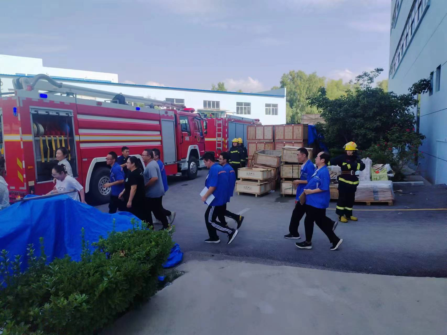 伴随着警报声响起,模拟火灾情境随即展开,员工们迅速采取行动,模拟用湿毛巾覆盖口鼻,采取弯腰姿势,在消防救援人员的疏导下,遵循预先设定的疏散路径,井然有序地从工作岗位撤离到安全地带。整个撤离过程紧凑而有条不紊,仅耗时5分钟便完成了所有人员的平安疏散。